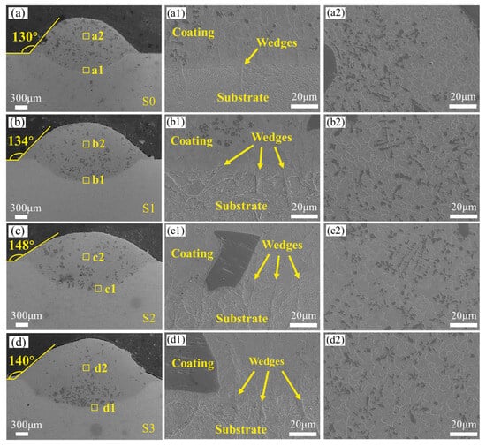 SEM morphologies of different specimens: (a–d). Cross-sectional morphologies of S0–S3 (a1–d1). Bonding area of S0–S3 (a2–d2). Middle area of S0–S3.