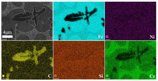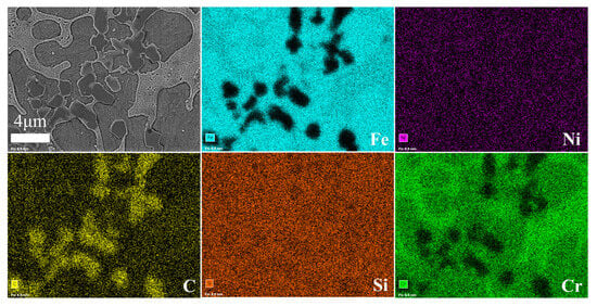 The microstructure of the cladding layer in various samples is illustrated in Figure 5. As observed from the figure, distinct dissolution lines are evident between the fusion cladding layer and the substrate, indicating the presence of a metallurgical bond between them. The composite coating exhibits heat-affected, bonded, and fusion cladding zones in a bottom-up sequence. Notably, the cross-section morphology of the composite coating is suboptimal at room temperature, characterized by significant gaps on the coating surface. However, preheating the substrate leads to noticeable improvements in the coating’s surface quality. According to Figure 5a–d, it can be seen that the distribution of TiC particles depends on the preheating temperature. The presence of convection in the molten pool during the preparation of Fe/TiC composite coating may lead to a shift in the distribution of TiC particles within the coating. Zhai et al. [] discussed the genesis of convection in the molten pool during laser cladding. They attributed the convection to two main factors: (1) natural convection arose from density variations in the cladding material, and (2) Marangoni convection generated by the molten pool due to surface tension. The preheating temperature will make the Marangoni convection more intense. Furthermore, the cladding angle of the coating demonstrates a trend of initial increase followed by a subsequent decrease. It has been reported in reference [] that a higher cladding angle value corresponds to a more extensive spread of cladding material on the substrate surface. As illustrated in Figure 5, numerous large-sized black particles are randomly dispersed throughout the coating. Figure 5(c1,d1) provides high-magnification views of these large-sized black particles within the coating. Single and petal-like particles are rich in Ti and C, and these TiC particles can be observed from the SEM images. These particles are produced by the dissolution/precipitation mechanism due to the decomposition of Ti and C atoms from the original TiC. Secondly, the powder we use is ceramic powder TiC particles, and the existing characterization methods can indicate that the black particles are TiC. Furthermore, the EDS mapping outcomes illustrated in Figure 6 and Figure 7 validate that these black particles are indeed TiC particles. The formation of TiC particles is attributed to the short duration of the laser cladding process, combined with rapid heating and cooling rates, rendering it challenging to fully melt the large-sized TiC particles []. Figure 5(a1–d1) depicts the binding area showcasing diverse cross-section morphologies of the specimens. At the bottom of the bonding area, various specimens exhibit a wedge-shaped structure. The wedge-shaped area of the room temperature composite coating is relatively small, whereas, with an increase in preheating temperature, there is a discernible tendency for the wedge-shaped area to expand. The presence of a wedge-shaped area facilitates extensive embedding of the coating into the substrate, indicating the formation of a robust metallurgical bond between the coating and the substrate, thereby ensuring a sufficiently strong bond interface. Notably, the direction of dendritic growth at the bottom of the coating is highly significant, with columnar crystals primarily growing perpendicular to the fusion line of the coating. This phenomenon arises due to slower heat dissipation near the substrate at the bottom of the melt pool, prompting particles at the bottom of the coating to grow upwards. Figure 5(a2–d2) displays the SEM morphology of the central area of the Fe/TiC composite coating, indicating that the solidification traits of the Fe/TiC cladding layer structure remain relatively unchanged.