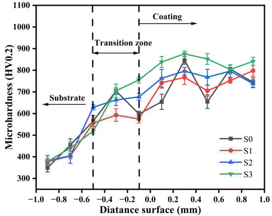 Figure 8 depicts the distribution of microhardness in the composite coating. Following calculation and analysis, the average hardness values for coating subjected to different preheating temperatures were determined as follows: 741 ± 50 HV (room temperature), 753 ± 50 HV (preheating temperature of 100 °C), 772 ± 50 HV (preheating temperature of 200 °C), and 842 ± 50 HV (preheating temperature of 300 °C). The hardness of the cladding layer predominantly fell within the range of 700 to 900 HV. Notably, at room temperature, the hardness of the cladding layer exhibited considerable fluctuation, possibly attributable to insufficient time for the complete diffusion of elements within the molten pool. Of particular interest, specimen S3 exhibited the highest average hardness, approximately 2.45 times that of the base 65Mn steel.