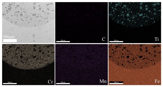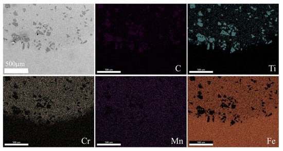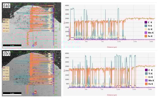 Figure 9 and Figure 10 depict the elemental distribution within the bonding zone of Fe/TiC composite coating for specimens S0 and S3. It is evident that both S0 and S3 specimens exhibit enrichment of Ti, Cr, Mn, and Fe elements within their bonding zones, alongside minor quantities of carbon (C) elements. Notably, when the substrate is preheated to 300 °C, enhanced diffusion of C and Mn elements into the Fe/TiC composite coating is observed, resulting in a homogeneous distribution of C and Mn within the Fe/TiC composite coating of the S3 specimen preheated at 300 °C, as illustrated in Figure 10. This phenomenon aligns with findings reported by Wang et al. [], who proposed that substrate preheating facilitates the sufficient diffusion of elements within the molten pool. To further verify this conclusion, EDS line scans were conducted on the S0 specimen at room temperature and the S3 specimen with the substrate preheated to 300 °C. This analysis aimed to investigate the interfacial element distribution and metallurgical bonding between the coating and substrates of each specimen, as illustrated in Figure 11. It is evident that the interface between the composite coating and the substrate is clearly discernible in both the S0 and S3 specimens, with the Fe/TiC composite coating exhibiting the highest concentrations of Fe and Ti elements. Additionally, in the S0 specimen, Ti element distribution appears non-uniform, potentially accounting for the significant microhardness fluctuations observed. Furthermore, as the scan progressed, molten iron from the substrate surface infiltrated the coating, leading to a gradual increase in iron content from the fusion-coated layer to the substrate. This phenomenon indicates mutual diffusion between the coating and substrate, affirming the establishment of a metallurgical bond between them.