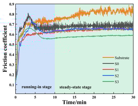 Friction coefficient curves of the substrate and the different specimens.