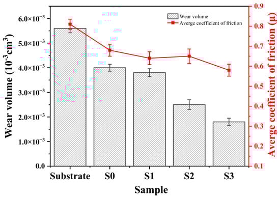 To examine the impact of different preheating temperatures of the substrate on the wear resistance of the composite coating, a series of friction and wear performance tests were performed on different samples. Figure 12 illustrates the evolution of the friction coefficient over time between Fe/TiC composite coating and 65Mn steel substrate under dry sliding conditions at different preheating temperatures, conducted at room temperature. The experimental findings reveal that initially, all specimens underwent a run-in stage in the friction and wear test, characterized by a rapid increase in friction coefficient accompanied by significant fluctuations. This behavior tended to stabilize with prolonged friction test duration. Hence, the friction coefficient for each specimen within the 10–30 min duration was utilized to calculate the average friction coefficient. This specific period is attributed to the steady-state regime. Initially, at a substrate preheating temperature of 300 °C, the average coefficient of friction for the coating was approximately 0.58, with a corresponding wear volume of about 0.0018 mm3, representing the lowest values observed and thus demonstrating the outstanding wear resistance of the S3 specimen. This enhancement notably augments the homogeneity of elemental composition within the composite coating, thereby promoting a relatively stable average friction coefficient. Furthermore, a comparative analysis of the average coefficient of friction and wear characteristics among the substrate (S0 specimen) and the composite coating with and without substrate preheating (S3 specimen) was conducted, as illustrated in Figure 13. The results suggest that the S3 specimen has an average friction coefficient that is 0.85 times lower than that of the S0 specimen and 0.72 times lower than that of the substrate. Additionally, the wear volume of the S3 specimen is 0.45 times lower than that of the S0 specimen and 0.32 times lower than that of the substrate. Thus, the preheating temperature of the substrate has a notable impact on the wear properties of the composite coating. Additionally, Figure 14 presents the wear morphologies of the Fe/TiC composite coating from different specimens. Observations reveal that the wear track width is most pronounced on the substrate, as depicted in Figure 14a, suggesting the substrate undergoes the most severe abrasion. This can be attributed to the softer nature of the 65Mn substrate compared with the friction-imposing Si3N4 steel ball, which exhibits the widest wear mark width under identical frictional conditions. Furthermore, examination of Figure 14b,c reveals the presence of grooves and flaking pits on the wear surfaces of the S0 and S1 specimens, indicating a combination of abrasive and adhesive wear mechanisms. Subsequent analysis of Figs. 14d–f illustrates the wear characteristics of the S2 and S3 specimens. Notably, when the substrate preheating temperatures were set at 200 °C and 300 °C, the abraded Fe/TiC composite coating displayed relatively smooth surfaces with only minor grooves and isolated pits, suggestive of light wear primarily attributable to slight abrasive action. Consequently, the judicious preheating of the substrate contributes to the enhanced wear resistance of the composite coating, primarily ascribed to the self-lubricating effect of preheating [].