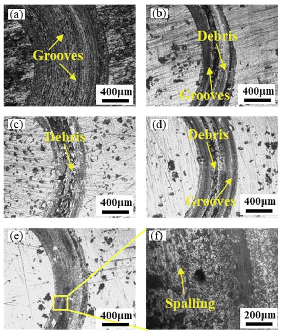 SEM wear morphologies of the different specimens: (a) substrate; (b) S0; (c) S1; (d) S2; (e) S3; (f) magnification of S3.