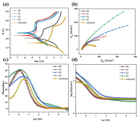 The curves of electrochemical tests. (a) Anodic polarization curves; (b) Nyquist plots; (c,d) Bode plots.