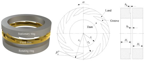 Figure 1 shows the geometrical model of the spiral groove DGS. The main seal pair consisted of a rotating ring and a stationary ring, which moved relatively. One of the rings was provided with logarithmic spiral grooves uniformly in the circumferential direction. The number of grooves was Ng, and the depth was hg. The root radius of the groove was rg, and the downstream side was the dam region without groove to limit seal leakage. A fluid film with micrometer thickness was formed between the end faces under the combined action of the hydrostatic and hydrodynamic pressure effects to avoid contact between two seal rings. The polar equation of the logarithmic helix is as follows: