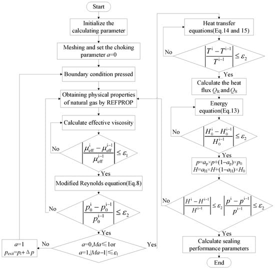 Figure 3 depicts the numerical procedure employed in this work. The governing equations were discretized and solved based on finite difference method and over-relaxation iteration. The boundary conditions and parameters were initialized, and the REFPROP database was invoked to obtain the physical properties of natural gas at different temperatures and pressures. Then, the modified Reynolds equation, heat conduction equations, and energy equation were solved by iterative coupling to obtain the distributions of fluid temperature, pressure and other flow field parameters between the end faces. The program also included iterative calculations of μeff and Mach number Ma, taking into account the influence of real fluid effects on the sealing performance at high pressure. In the program, the average relative error of each parameter was taken as the convergence criterion. The convergence residuals were ε1 = 10−3, ε2 = 10−5, respectively. When considering the choking effect, it was necessary to determine whether Ma is less than 1 at the inner diameter with the highest flow rate in the seal clearance. Otherwise, a tiny pressure was added on the basis of the original outlet pressure until Ma ≤ 1.