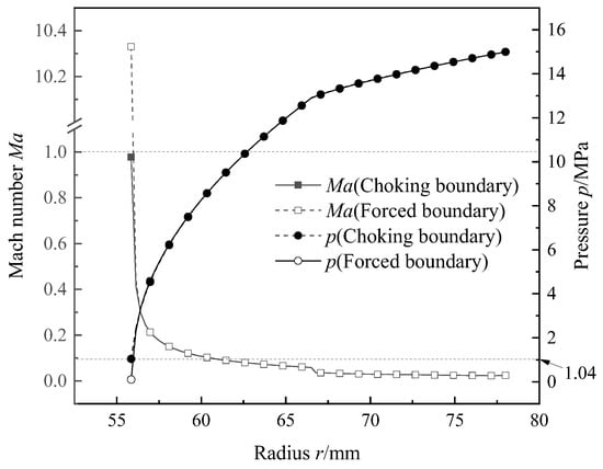Due to the large pressure difference between both ends of the end face, the flow rate of the gas continued to increase. However, the flow channel gradually decreased with the radius, and the flow rate of the seal gas could not exceed the sound velocity, resulting in the choking phenomenon, which caused the outlet pressure of the seal to be higher than the ambient pressure. Figure 6 shows the distributions of the Ma and p on the end face under the choking pressure boundary condition and the forced pressure boundary condition. It can be seen that there was no obvious difference between the two conditions at the grooved area, and there was only little localized difference at the sealing dam region near the inner diameter. When the forced pressure boundary condition was adopted, the pi was always equal to 0.1 MPa. The Ma at the inner diameter was much higher than 1, and even up to 10, resulting in a supersonic region. However, when the actual flow rate reached the sound velocity, it could not continue to increase due to the choking effect. Therefore, the forced pressure boundary condition could not be applied to the case of choking occurring. When the choking pressure boundary condition was adopted, the maximum Mach number of the fluid in the seal clearance was less than 1 by constantly adjusting the value of the outlet pressure. The final value of the outlet pressure was 1.04 MPa after calculation.