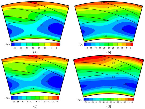 The pressure difference distributions on end face of different natural gas samples under default working conditions. (a) Δp15. (b) Δp25. (c) Δp35. (d) Δp45.