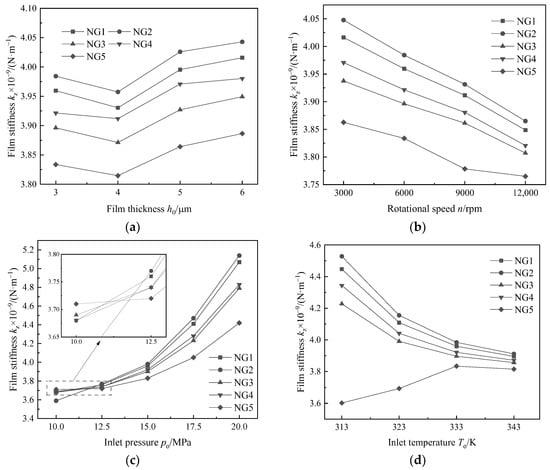 Variation curves of gas film stiffness of natural gas DGS with different working conditions. (a) Film thickness. (b) Rotational speed. (c) Inlet pressure. (d) Inlet temperature.