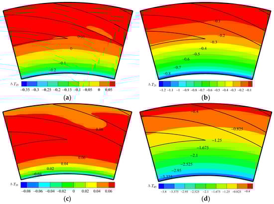 In order to further study the influence of different components of natural gas on the ΔT of the end face, the temperature distribution of the end face under the same working conditions was analyzed. Figure 18 shows the temperature difference distributions on the end face of different natural gas samples under the default working condition, where ΔTi5 is the temperature difference between Ngi (i = 1, …, 4) and NG5: