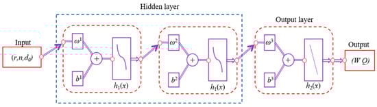 As a nonlinear fitting algorithm, the BP neural network can process and fit complex functional relationships with strong applicability. Therefore, the BP neural network is chosen to fit the model [17,18]. The constructed neural network is shown in Figure 3. The input layer consists of three variables, namely, the distribution circle radius r, the number of orifices n, and the aperture of orifice d0. Two hidden layers are selected for nonlinear mapping, and the output layers are bearing capacity and mass flow.