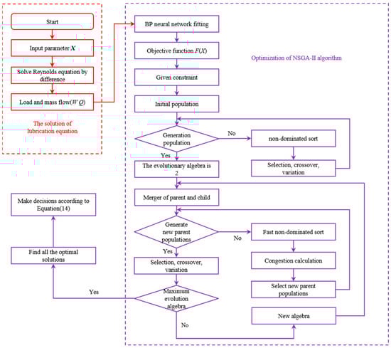 where and are the deviation of bearing capacity and mass flow from the optimal solution; is the size of bearing capacity in the Pareto frontier optimal solution, and is the size of each mass flow in the Pareto frontier optimal solution. , , , are the maximum and minimum values of bearing capacity and mass flow in the Pareto frontier optimal solution. By calculating from Equation (14), the optimal bearing capacity and mass flow of the bearing under vacuum can be obtained, and the corresponding solution is the optimal design parameter of the bearing. The calculation process is shown in Figure 4.