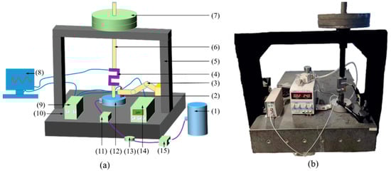 To test the static characteristics of aerostatic bearings under different air supply pressures and loads in a vacuum environment, a test platform was constructed, as shown in Figure 6. The test platform mainly consists of a measuring platform (1), a cushion block (2), a bearing to be tested (3), a weight (4), a gauge frame (5), a dial gauge (6), a vacuum tank (7), a ZJ51-T resistance gauge is sourced from Rui Bao Technology, Chengdu, China (8), a data acquisition and processing system (9), a vacuum pump (10), a computer (11), an air pump (12), a valve (13), a pressure gauge (14), and a flow meter (15).