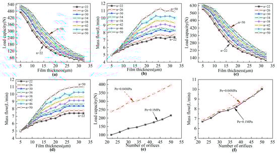 Influence of air film thickness and number of orifices on bearing performance under different environmental pressures: (a) influence of air film thickness and orifice number on bearing capacity under atmospheric pressure; (b) influence of air film thickness and orifice number on mass flow under atmospheric pressure; (c) influence of 4000 Pa environmental air film thickness and the number of orifices on the bearing capacity; (d) influence of air film thickness and orifice number in 4000 Pa environment on mass flow; (e) influence of the number of orifices under different environmental pressure on the bearing capacity when the air film thickness is 20 μm; (f) influence of the number of orifices under different ambient pressure on the mass flow when the air film thickness is 20 μm.
