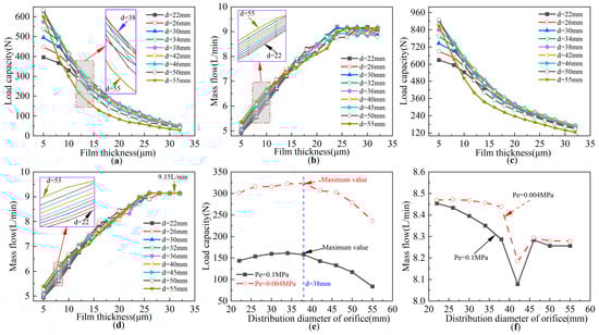 Influence of air film thickness and orifice distribution diameter on bearing performance under different environmental pressures: (a) influence of air film thickness and orifice distribution diameter on bearing capacity under atmospheric pressure; (b) influence of air film thickness and orifice distribution diameter on mass flow under atmospheric pressure; (c) influence of air film thickness and orifice distribution diameter on bearing capacity in 4000 Pa environment; (d) influence of air film thickness and orifice distribution diameter on mass flow in 4000 Pa environment; (e) influence of the distribution diameter of orifice under different ambient pressure on the bearing capacity when the air film thickness is 20 μm; (f) influence of different ambient pressure distribution diameters on mass flow when the air film thickness is 20 μm.