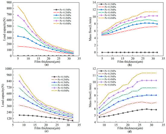 Influence of air supply pressure on bearing performance under different environmental pressures: (a) influence of atmospheric air supply pressure on the bearing capacity; (b) influence of atmospheric air supply pressure on mass flow; (c) influence of 4000 Pa ambient air supply pressure on the bearing capacity; (d) influence of 4000 Pa ambient air supply pressure on mass flow.