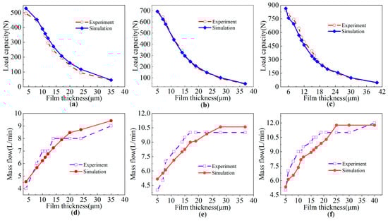 Comparison of simulation and experiment in atmospheric pressure environment: (a) comparison of bearing capacity when Ps = 0.4 MPa; (b) comparison of bearing capacity when Ps = 0.5 MPa; (c) comparison of bearing capacity when Ps = 0.6 MPa; (d) mass flow comparison when Ps = 0.4 MPa; (e) mass flow comparison when Ps = 0.5 MPa; (f) mass flow comparison when Ps = 0.6 MPa.