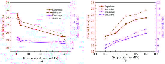 When the ambient pressure is 0.1 MPa, and the air supply pressure is 0.4 MPa, 0.5 MPa, and 0.6 MPa, respectively, the bearing capacity and mass flow obtained by simulation and test are shown in Figure 14. According to Figure 14, under different air supply pressures, bearing capacity decreases with the increase in air film thickness, and mass flow increases with the increase in air film thickness. The load capacity and mass flow obtained by simulation are in good agreement with the experimental values. To further verify the correctness of the simulation, the influence of different environmental pressure and supply pressures on the bearing air film thickness when the bearing load is 280 N was tested, and the results are shown in Figure 15.