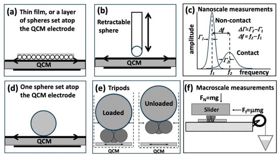 When employed for nanotribology applications, QCM is capable of directly linking nanoscale and macroscale properties because the typical peak electrode velocities of up to several m/s and the shear rates of about 106 s−1 are comparable to those of macroscale systems. The method has been broadly applied to a wide range of soft material systems [,] and is sensitive to both mass deposition on its surface electrode and the viscoelastic coupling of fluids it may be in contact with []. It has also been used in geometries consisting of bare and lubricated tribological contacts with external objects such as spheres spanning a few μm to cm in diameter. Changes in the QCM frequency and dissipation in response to the external contacts yield information on the contact stiffness and/or friction coefficients [,]. Exceptionally high-quality factors Q~106 of QCM allow for precise measurements of shifts in frequency Δf and changes in ΔQ, which are inversely proportional to the half-bandwidth ∆Γ (Figure 2c). To enable a cross-comparison of QCM studies, the highlights selected for this section employ QCMs oscillating in the fundamental mode at or near 5 MHz, with gold or steel electrodes (Figure 2). Further reading on the modeling of contacts at the atomic scale, including QCM response, may be found in refs. [,,,].