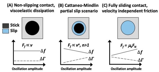 Schematic of the Δf and ∆Γ response of a QCM in three distinct idealized continuum contact conditions. (From Seed et al. [] and licensed with permission from Creative Commons 4.0. (http://creativecommons.org/licenses/by/4.0.)) (A) A non-slipping viscoelastic contact, (B) a partially slipping contact with the slipping regions governed by a Coulomb friction, and (C) a fully slipping contact governed by a Coulomb friction.