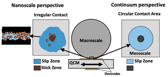 Schematic comparing nanoscale to macroscale perspectives for modeling of a sphere in tribological contact with a QCM electrode. (From Seed et al. [] and licensed with permission from Creative Commons 4.0. http://creativecommons.org/licenses/by/4.0).
