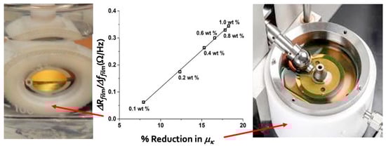 Daikhin et al. employed a QCM immersed in water or butanol to study the adsorption of pyridine as an additive and reported the results in this 2000 publication []. In non-slip conditions (Figure 5d), the total response of the QCM is