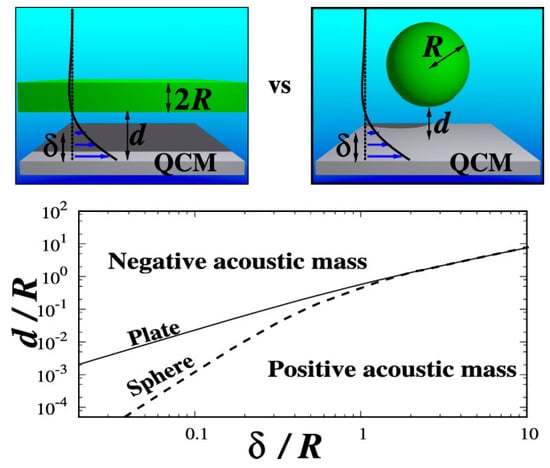 Regimes of positive (“negative acoustic mass”) and negative (“positive acoustic mass”) frequency shift for plate and sphere geometries in terms of the unitless quantities d/R and δ/R. The results demonstrate that mass-loading does not always result in a negative frequency shift for NPs added to liquids. (From Melendez et al. []) and licensed with permission from Creative Commons 4.0 (http://creativecommons.org/licenses/by/4.0).
