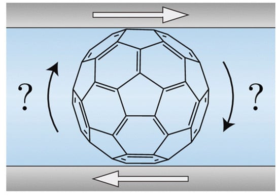 Close to thirty years have passed since the pioneering work of Campbell et al., who utilized a surface forces apparatus to study intermolecular interactions and the nanotribology of adsorbed C60 monolayers on mica surfaces immersed in toluene []. The results have raised speculation that observed molecular “ball-bearing”-like attributes might give rise to macroscale lubricity since C60 molecules are near-perfect spheres, and when contacting crystalline solids, the molecules can rotate rapidly while remaining in their lattice positions (Figure 8). Campbell et al. noted that such lubricity was not observed for C60 alone, including control molecular-scale experiments performed in air using 50 nm C60 films deposited on mica []. However, these authors discovered that the deposition of one or two weakly bound monolayers atop mica surfaces resulted in the full-slip (zero interfacial friction, within the detection limit of the apparatus) boundary conditions when immersed in a C60 additive suspension. The observed tribological behavior was dramatically different from that of conventional fluids. The authors concluded that C60 could hold great promise as a macroscale lubricant additive and suggested the interfacial slippage might be linked to a rapid rotation of the molecules that somehow produced an effective boundary of near-zero drag on the adjacent liquid.