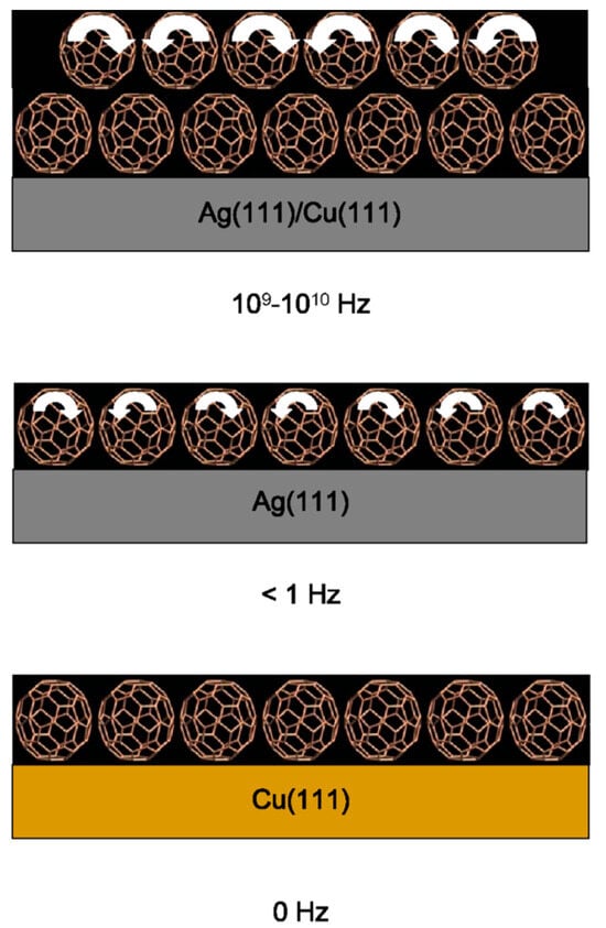 To explore and isolate the role of molecular rotation on friction, Coffey and Krim measured sliding friction on fixed and rotating C60 layers by preparing substrates upon which the C60 molecules rotated at a high rate (109–1010 Hz), a slow rate (<1 Hz), or did not rotate at all (Figure 9). Sliding friction for methanol on various substrates was measured at room temperature, and for krypton layers at 77 K. At the latter temperature, all rotations are known to cease. To the best of our knowledge, this was the first experimental report to directly link friction to a documented molecular rotation state. The observed friction was, however, higher when the C60 was rotating, in defiance of the ball-bearing analogy. See also Refs. [,] for closely related theoretical and experimental studies.