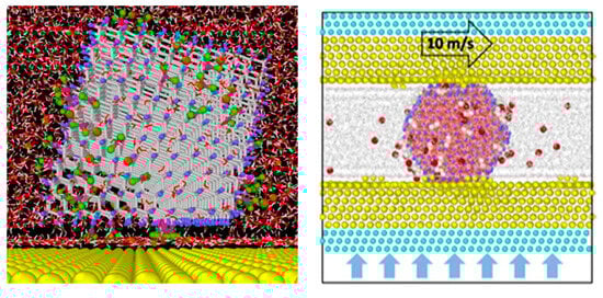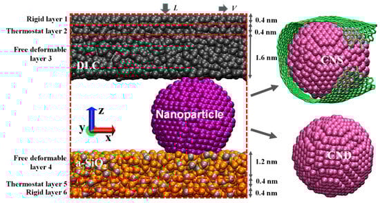 In this study, Zhao et al. [] compared the tribological properties of carbon nanoparticles including nanodiamonds (NDs) and nanoscrolls (NSs) formed by wrapping graphene sheets around nanodiamonds. The authors performed nonequilibrium molecular dynamic simulation of sliding diamond-like carbon over the nanoparticles supported by amorphous silica slabs (Figure 10). The friction coefficient for the sliding of nanoscrolls was observed to be 72% lower than that of the nanodiamonds and found to be in a regime of superlubricity (m ≤ 0.01) consistent with the experimental observations.