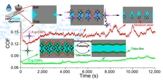 - Wang, B.; Yao, L.; Dai, S.; Lu, H. Astonishingly distinct lubricity difference between the ionic liquid modified carbon nanoparticles grafted by anion and cation moieties. Friction 2023, 11, 949–965. [Google Scholar] [CrossRef]