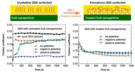 - Liu, C.; Friedman, O.; Li, Y.; Li, S.; Tian, Y.; Golan, Y.; Meng, Y. Electric response of CuS nanoparticle lubricant additives: The effect of crystalline and amorphous octadecylamine surfactant capping layers. Langmuir 2019, 35, 15825–15833. [Google Scholar] [CrossRef]