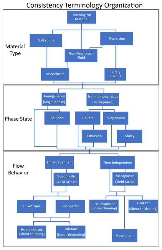Consistency is a quantification of the structural integrity of a material that exhibits both fluid- and solid-like behavior. Such materials include non-Newtonian fluids, viscoelastic materials, dispersions, structured liquids, soft solids, semi-fluids, semi-solids, and more. Some of these terms are organized in Figure 1. Such a chart should only be used for a basic understanding of the subject, as many materials do not neatly fit within the organizational structure given due to the overlapping scopes of many of the terms contained within. Because of this ambiguity, the present authors adopt the term “rheological material” to include all materials for which the term “consistency” applies in a mechanical sense. These materials are used in a vast range of fields, such as food/dairy, pharmaceutical, cosmetic, lubricating grease, cement/concrete, grout/mortar, bitumen, paints/coatings, paper pulp, printing ink, toothpaste, blood tests, drilling mud, sewage, and soil analysis [1,2,3,4,5,6,7].