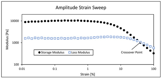 Within the linear viscoelastic region, G′ and G″ are dependent on frequency, but not on stress amplitude. This makes oscillatory testing a good choice for observing the microstructure without altering it. If the amplitude is increased, nonlinearities begin to set in, and the linear theory of viscoelasticity is not sufficient to describe the non-Newtonian behavior [47,50]. When amplitudes become high, the material begins to flow, and behavior is characterized in a different manner [52].