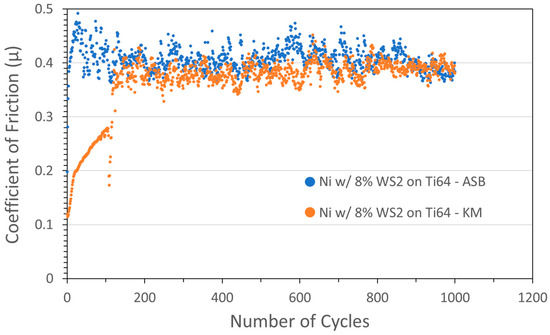 Tribometry results from the 1000-cycle tests using a 2N load on Ni/WS2 cold spray coatings on Ti-6Al-4V substrates. Testing was conducted in dry N2. Shown are coatings produced on ASB equipment (blue; nominally 8 wt% WS2) and Applied Tungstenite equipment (orange; nominally 8 wt% WS2). Ni particle size range was +11/−45 µm and WS2 average particle size was 5 µm. The XRF measurement of the KM coating showed the actual WS2 content was 59 wt%.