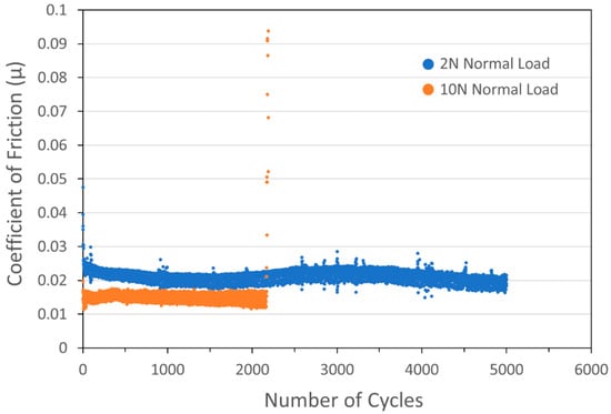 Tribometry results from the 5000-cycle tests on a pure WS2 cold spray coating on a 303SS substrate. Testing was conducted in dry N2. Shown is data for testing with 2N (blue) and 10N (orange) normal load. The average WS2 particle size was 24 µm. The 2N test lasted the full 5000 cycles, while the 10N test failed after 2200 cycles.
