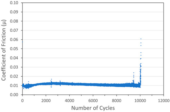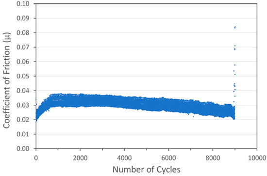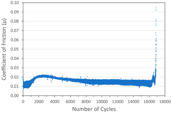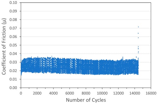 To demonstrate the performance of the coatings in a more space-like environment, ball-on-flat tribometry was conducted on several coating formulations in a vacuum (3.5 × 10−4 Torr or 0.047 Pa) using an RTEC Vacuum Linear Reciprocating Tribometer. Vacuum testing was designed so that the loads and contact geometry (especially Smax) were close to those used in the N2 testing in the Anton Paar tribometer. Typical vacuum tribometry data are shown in Figure 15 for a pure WS2 cold spray coating on a 304 SS substrate.