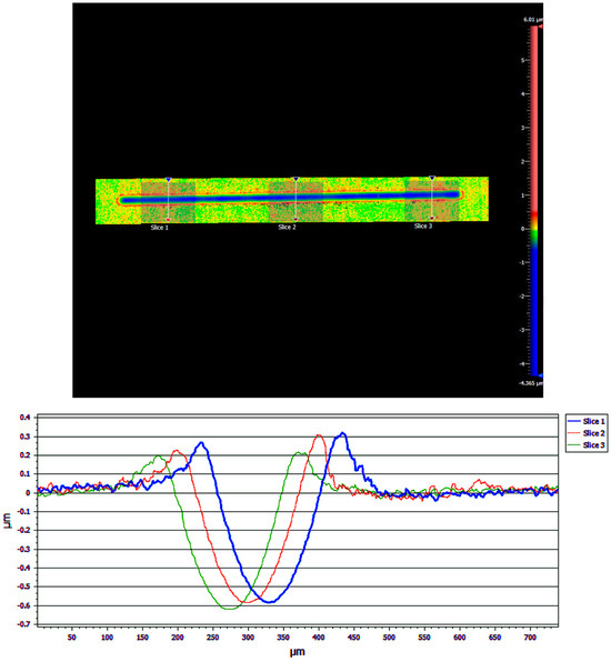 Results from the WLI imaging of one of the samples are shown in Figure 13. The blue line in the upper image represents the wear track, where the blue color represents a negative height due to wear, and these are the valleys seen in the three cross-sectional profile traces in the lower part of the figure. The green area is the level of the unworn coating, which was set arbitrarily to zero. The red areas next to the wear track represent positive heights and correspond to the raised “wings” in the profile traces in the lower part of the figure. These wings are likely worn coating material that has built up at the edges of the wear track. This material can act as a lubricant reservoir that can be cycled back into the contact region during sliding.