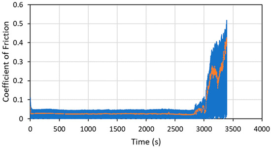 Tribometry results on a pure WS2 cold spray coating on a 304 SS substrate tested in a vacuum of 0.047 Pa (3.5 × 10−4 Torr). An 11.2N normal load was used (which matches the Smax value for the N2 testing within 0.5%), and the test was run until failure. The average WS2 particle size was 100 nm. The raw data are shown in blue, and a smoothed average of the data is shown in orange. The ordinate is in time units, and failure occurred at about 2800 cycles.