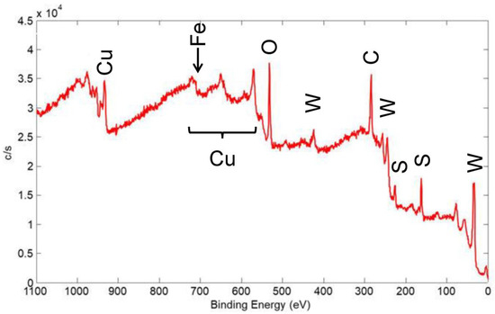 XPS spectra were acquired for several coatings to determine the elements present on the surface and their chemical state. In addition, the surface sensitivity of XPS helped in determining the coating coverage on the substrate surface. In Figure 19, an XPS wide scan of the surface of a coating made from a nominal mixture of 1 μm Cu with 90 wt% 100 nm WS2 is shown, and this coating was similar to the one represented in Figure 17. The spectrum showed the expected presence of the constituents of the coating, including Cu, W, and S. It also showed C and O that were from adsorbed contaminant species usually seen on the surface of air-exposed materials: the C is adventitious carbon, usually due to adsorbed organic species, while the O is from adsorbed H2O and other oxygen-containing molecules, as well as oxidation products of the coating materials.