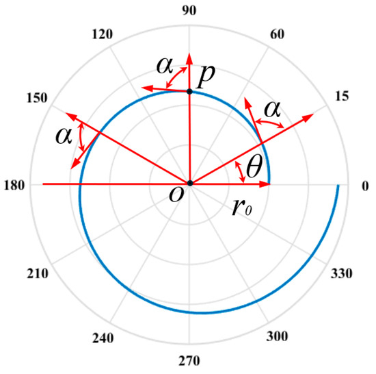 The logarithmic spiral, also known as the equiangular spiral, is illustrated in Figure 1. A logarithmic spiral is a curve where the angle between the tangent at any fixed point and the vector OP from a fixed point O to P (known as the strike angle) remains constant. Equation (1) presents the parametric equation of the logarithmic spiral. The logarithmic spiral finds extensive applications in mechanical engineering, aerospace, and other fields, offering new perspectives and inspiration for addressing various transmission challenges.