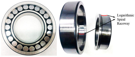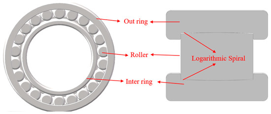 A logarithmic spiral bearing is a type of cageless bearing that consists of an outer ring, an inner ring, and rollers, as illustrated in Figure 2. A logarithmic spiral bearing features unique structural characteristics compared to traditional cageless bearings. The raceway profiles of both the inner and outer rings are logarithmic spirals. This design effectively prevents the rolling elements from erratically shifting in the axial direction, achieving axial self-locking of the rollers within the raceways, thus enhancing the stability and lifespan of the bearing.