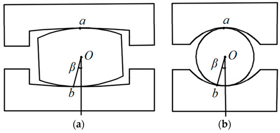 Figure 3 shows a schematic diagram of the axial contact of the bearing. As depicted, under the action of only radial load Fr, the rolling elements have contact points a and b with the inner and outer rings of the bearing, respectively. Assuming the contact point a between the outer ring and the rolling element remains unchanged, the angle between the line connecting contact point b between the inner ring and the rolling element and the average passing through the center point O is the contact angle β. Since the magnitude of the contact angle β is independent of the bearing type but is related to the contact point b between the inner ring and the rolling element, this paper focuses on logarithmic spiral cylindrical roller bearings as the research object.
