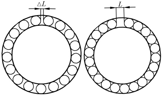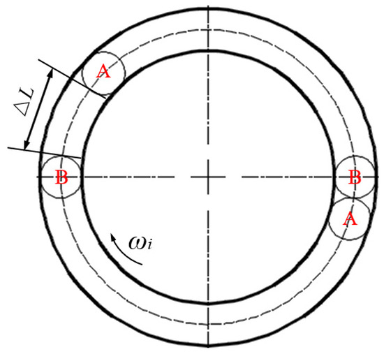 According to Equations (9) and (10), it can be observed that the rolling element has the slowest orbital speed at the lowest point of the groove and the fastest orbital speed at the highest point away from the groove bottom. Different orbital speeds are the fundamental cause of rolling element collisions and abrasion. Figure 8 illustrates a schematic of rolling element collisions. It is assumed that the rolling element A contacts the inner ring at the lowest point of the groove (the orbital speed of rolling element A is v1) and rolling element B contacts the inner ring at the highest point of the non-groove (the orbital speed of rolling element B is v2). When rolling element B rotates precisely half a turn and collides with rolling element A, the circumferential gap between rolling element A and rolling element B is represented by ∆L, as shown in Figure 8.