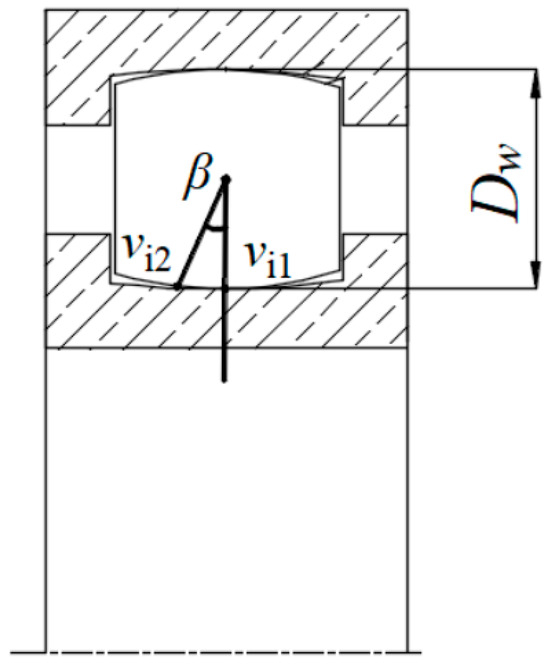 It is assumed that the angle between the contact points of the rolling element with the highest and lowest points of the inner raceway is β, as shown in Figure 6. The linear velocity of the rolling element at the lowest point on the inner raceway is vi1, which can be expressed as follows: