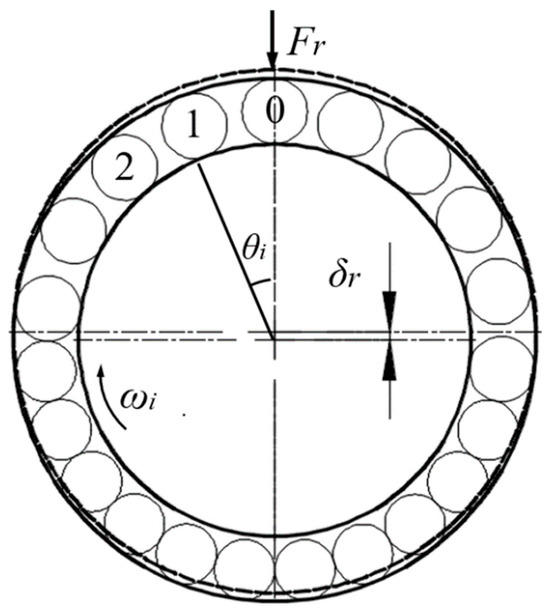 According to Equation (11), when θi = 0, δi = δr = δmax, indicating that the contact deformation between the 0th rolling element and the raceway is at its maximum, and the load is at its maximum. When θi = 90°, δi = 0, indicating that the limit angle of the loaded region is ±90°, that is, the loaded region is 180°, with half of the raceway loaded. Due to the internal clearance in the bearing, the bearing area generated by the radial load Fr will be less than 180°. Therefore, at most, only half of the raceway rolling elements are loaded simultaneously.
