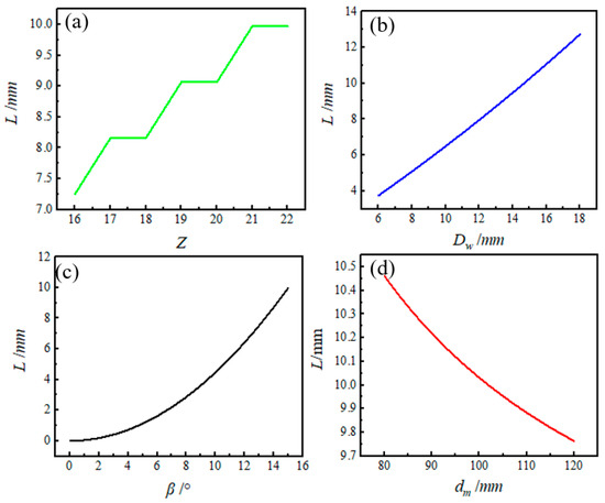 Influence of design parameters on total circumferential clearance L. (a) Influence of rolling element diameter Dw on L. (b) Influence of bearing pitch circle diameter dm on L. (c) Influence of contact angle β on L. (d) Influence of number of rolling elements Z on L.