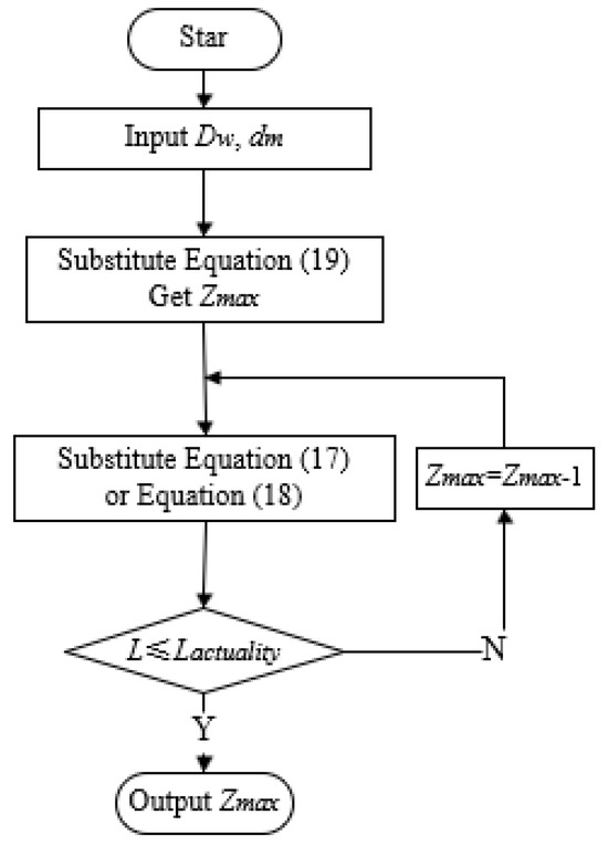 The new method for calculating the number of rolling elements is as follows: the rolling element diameter Dw and the bearing pitch diameter dm are substituted into Equation (19) to obtain Zmax. Then, Zmax is substituted into Equation (17) or Equation (18) to obtain the minimum circumferential total clearance L to avoid rolling element collisions. Next, the sizes of the circumferential total clearance L and the actual circumferential total clearance Lactuality are compared. If the actual circumferential total clearance Lactuality value is more significant than L, the value of Zmax is output. Otherwise, Zmax = Zmax − 1, and then, it is substituted into Equation (17) or Equation (18) again until the value of Zmax is output. The specific calculation process is shown in Figure 10.