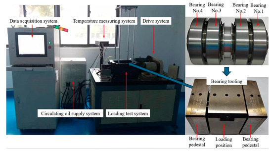 This study used the BLT-MST bearing testing machine to perform bearing clearance tests, as illustrated in Figure 12. Following the heavy load conditions specified for an aviation main shaft bearing, the tests followed the procedures listed in Table 4. During the tests, we closely monitored parameters such as shaft temperature, oil supply temperature, and spindle current for abnormalities. We continuously monitored and sampled the bearing temperature data until either we detected an abnormal change in the bearing parameters or the bearing operated stably for 250 h. At that point, we manually terminated the test.