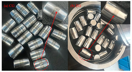 The logarithmic spiral cylindrical roller bearing comprises an inner ring, an outer ring, and rollers. The machining of the logarithmic spiral raceways on the inner and outer rings involved six stages: forging, turning, heat treatment, rough grinding, finishing, and superfinishing. Utilizing a step-by-step approximation strategy, these processes formed the core of the manufacturing flow. The finished samples of the logarithmic spiral bearings are shown in Figure 11.